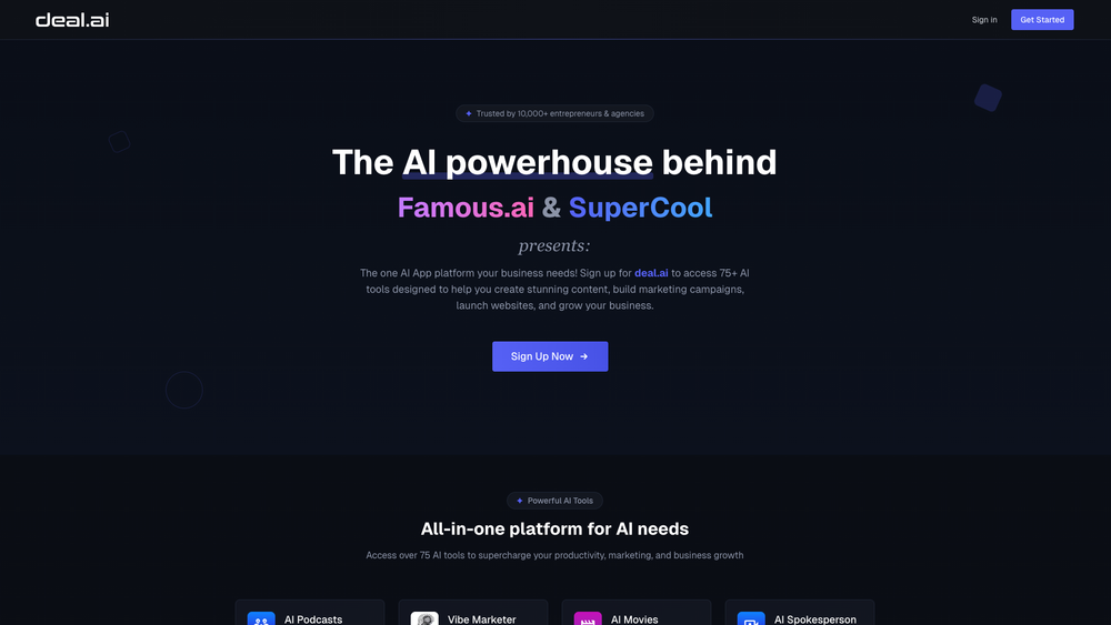 deal.ai est une plateforme IA complète qui regroupe plus de 75 outils pour la création de contenu, le marketing, la croissance d'entreprise, l'éducation et bien plus encore. Elle est conçue pour aider les entrepreneurs, les agences et les créateurs à tirer parti de l'IA pour développer des entreprises rentables sans avoir besoin d'expertise technique.