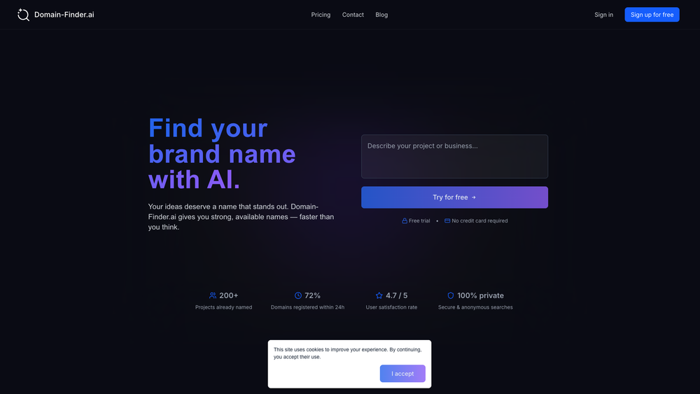Domain-Finder.ai est un outil en ligne qui utilise l'intelligence artificielle pour générer des suggestions de noms de domaine. Il aide les utilisateurs à trouver des noms de domaine créatifs et pertinents pour leurs projets, entreprises ou idées, tout en vérifiant leur disponibilité en temps réel.