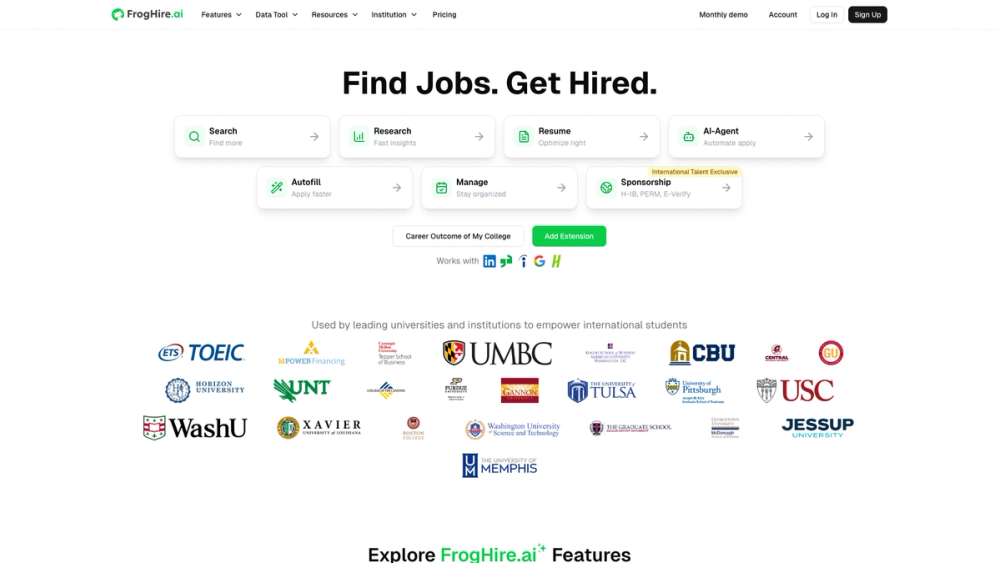 FrogHire.ai est une plateforme conçue pour aider les étudiants internationaux à trouver des emplois aux États-Unis, en particulier ceux qui nécessitent un parrainage de visa (OPT, CPT, H-1B). Elle utilise l'IA pour faciliter la recherche d'emploi, l'optimisation de CV et la gestion des candidatures.