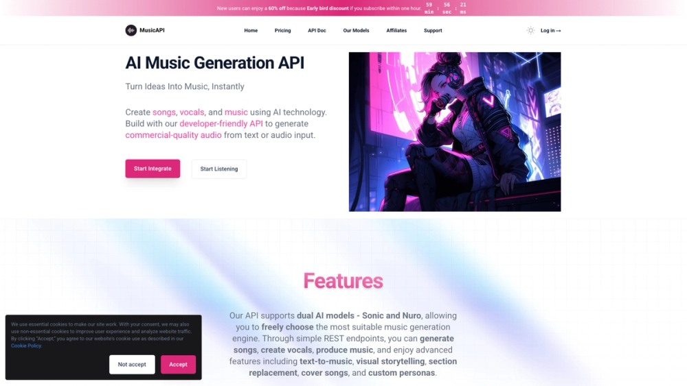 MusicAPI est une API de génération de musique basée sur l'IA, conçue pour les développeurs. Elle permet de créer facilement de la musique, des voix et des chansons de qualité commerciale à partir de texte ou d'audio. Avec des licences commerciales, un traitement simultané et un support d'entreprise, MusicAPI offre une solution complète pour la génération de musique assistée par l'IA.
