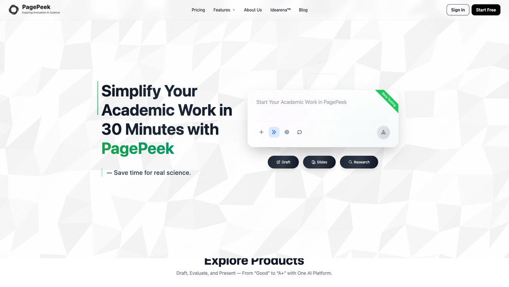 PagePeek est une plateforme académique basée sur l'IA conçue pour aider les chercheurs, les étudiants et les éducateurs à rédiger, évaluer et présenter facilement leurs travaux universitaires. En automatisant les tâches académiques répétitives, PagePeek permet de gagner un temps précieux pour se concentrer sur ce qui compte vraiment : la recherche et l'innovation scientifique.